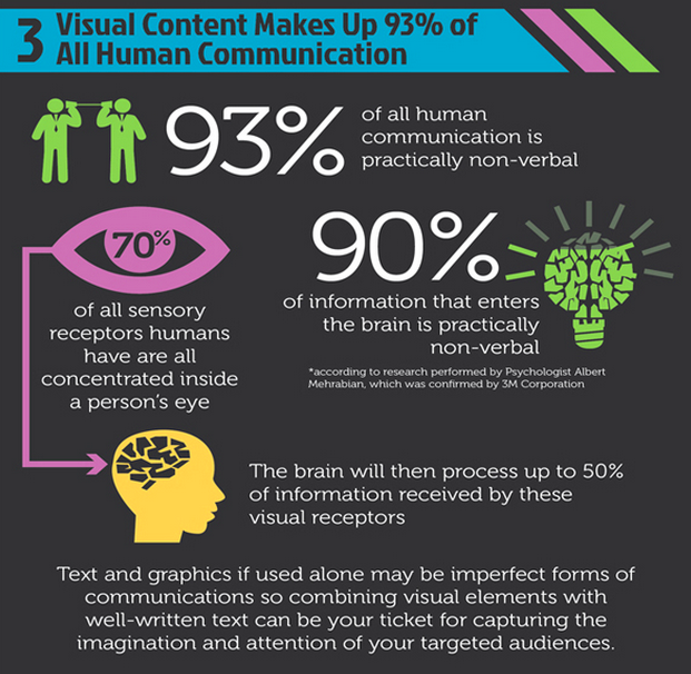 3. Nuestra naturaleza humana: El 90% de la información que trasmitimos a nuestro cerebro es visual, concretamente, procesamos las imágenes 60.000 veces más rápido que los textos, los cuáles recordamos infinitamente menos que las imágenes (un 20% contra un 80%) según informa Puro Marketing. Es decir somos seres primariamente visuales y estamos programados biológicamente de este modo.