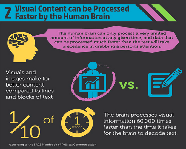3. Nuestra naturaleza humana: El 90% de la información que trasmitimos a nuestro cerebro es visual, concretamente, procesamos las imágenes 60.000 veces más rápido que los textos, los cuáles recordamos infinitamente menos que las imágenes (un 20% contra un 80%) según informa Puro Marketing. Es decir somos seres primariamente visuales y estamos programados biológicamente de este modo.